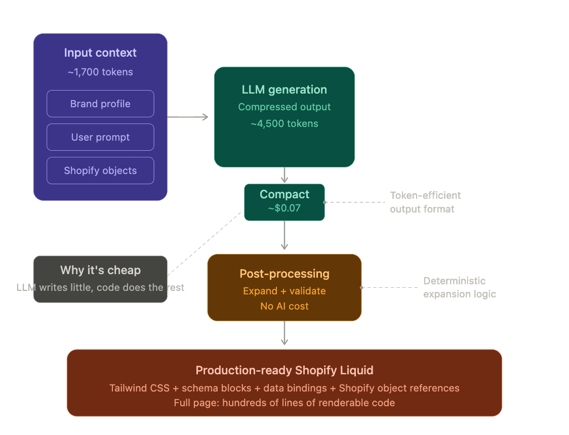 We built a generation pipeline which only asks the LLM to produce compressed, token-efficient outputs, which are then expanded through a post-processing pipeline into full, production-ready Liquid with all the necessary data bindings, schema blocks and styling. This lets us generate pages faster and price competitively. Instead of asking an LLM to write 500 lines of Liquid code directly, we're asking it to produce only the essential structure and the main content decisions. Think of it like a genie: "Phenomenal cosmic power, itty-bitty living space." That's what lets us pass the savings on to merchants.