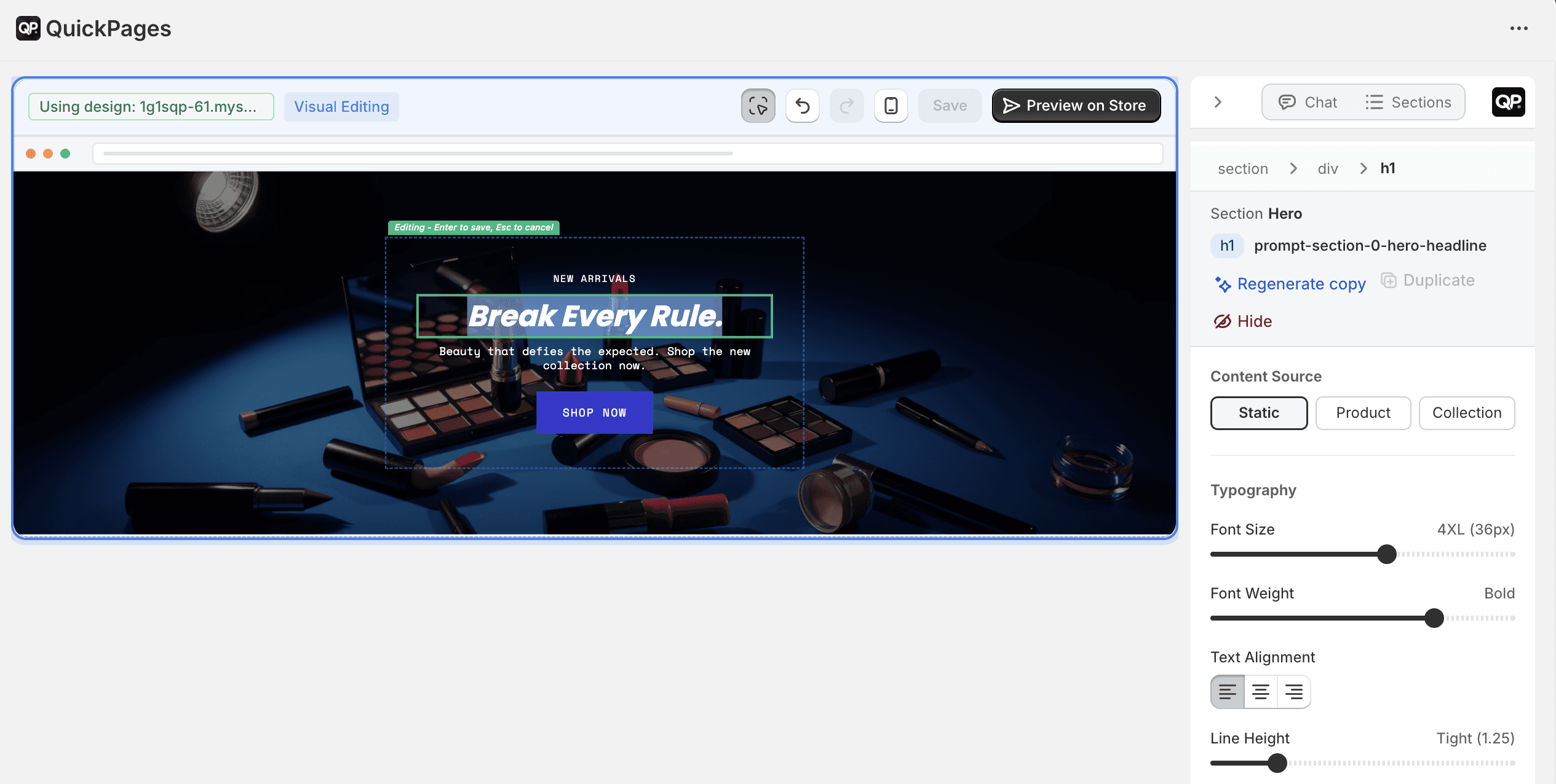 Sometimes it's faster to show than to describe. For those moments, we built a visual editing layer that lets you refine generated pages without touching code.