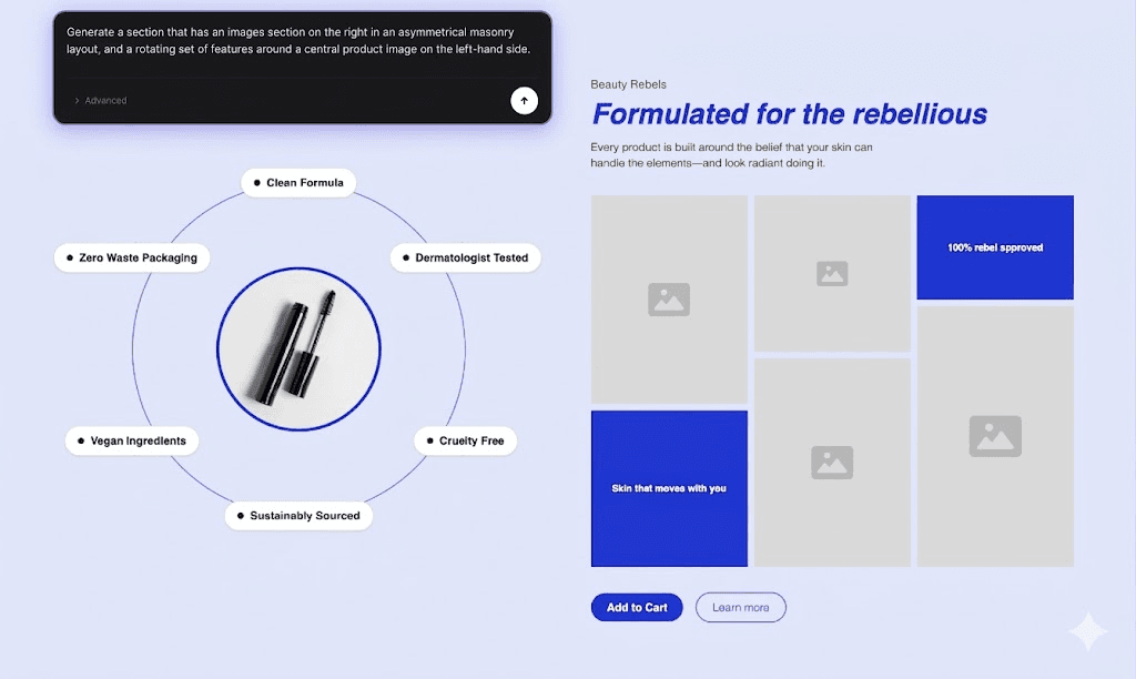 The Shopify ecosystem is so used to templates that changing from this will take some adjustment. But look at what becomes possible when the ceiling is removed. Instead of browsing a library hoping something is close enough, you describe exactly what you want: "an asymmetrical masonry image grid on the right, with a rotating set of features around a central product image on the left." That's not a layout you'll find in any template library. It doesn't exist until you describe it.